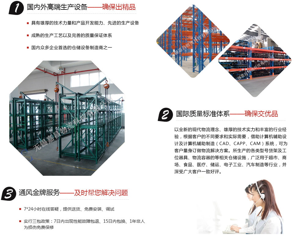 無錫嘉昌倉儲貨架有限公司擁有多年的設計、生產(chǎn)、管理經(jīng)驗。以全新的現(xiàn)代物流理念、雄厚的技術實力和豐富的行業(yè)經(jīng)驗,根據(jù)客戶的不同要求和實際需要,借助計算機輔助設計及計算機輔助制造(CAD、CAPP、CAM)系統(tǒng),可為客戶量身訂做物流解決方案。所生產(chǎn)的各類型號貨架及工位器具、物流容器的等相關倉儲設施,廣泛用于超市、商場、食品、醫(yī)療、儲運、電子工業(yè)、汽車制造等行業(yè),并深受廣大客戶一致好評。